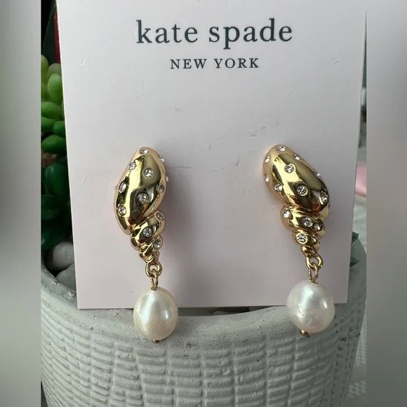NWT Kate Spade Under the Sea Tulip Pearl Gold Tone Shell Drop EarringsDust bag included Tulip shell drop earrings handcrafted from shiny pavé-detailed gold-plated metal that catches the light so nicely, and the delicate freshwater pearl that suspends from the twisted shell is striking in the most sophisticated wayMATERIAL* gold-plated brass, cubic zirconia, freshwater pearlFEATURES* width:0.38"* drop length: 1.38"Retails $78