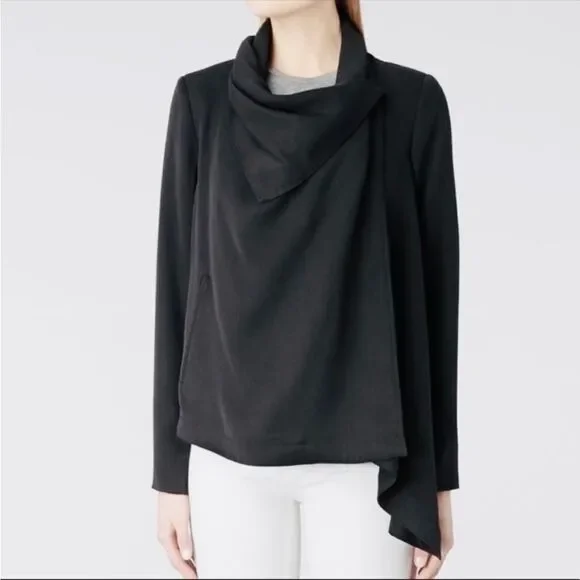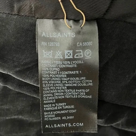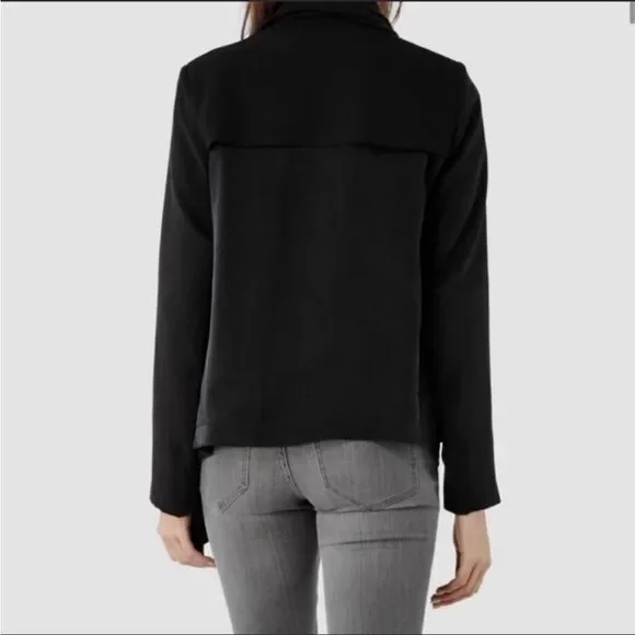 *Better pictures to come!*New without tags, flawless condition black Bayle Monument jacket by All Saints, size 4.The bayle monument jacket is the perfect transseasonal style that can be worn with anything. Made in a soft material with a texture contrast black on black cupro back panel.Asymmetrical and flowy the draped collar looks cool buttoned different ways. Features asymmetric draped collar, satin lining, and contrasting back panel. Soft and lightweight minimalist jacket.Shell: 100% LyocellContrast: 100% CuproTrim Cloth: 100% Polyester Comes from a smoke and pet-free home. Reasonable offers encouraged. Bundle 4 or more items for at least 10-15% off original total price, plus discounted shipping!